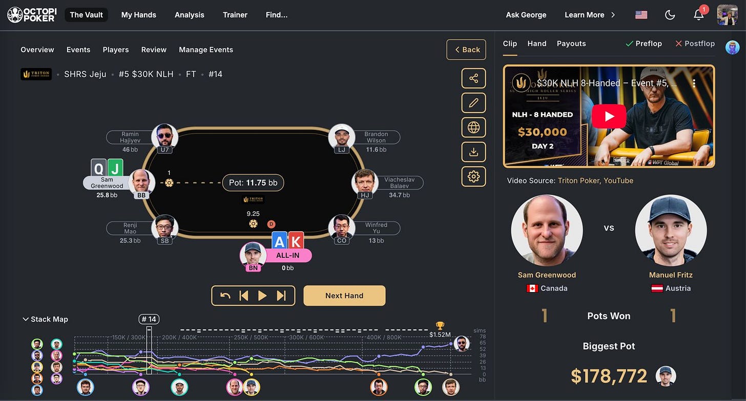 The Vault is a database of Triton, WSOP, and PokerGo final tables with ICM sims loaded such that you can review an entire FT start to finish and look at simulations that have been run at the final table. You can also train hands that were played at the FT or play as an individual player and see what it’s like to play a FT from the perspective of Stephen Chidwick or Alex Foxen. In the Triton Jeju Series that ran earlier this winter, I final tabled the $30k NLHE, and I was 3/7 but trailing the two chip leaders by a good amount when I made a loose call vs. the preflop shove of Manuel Fritz, one of three short stacks. Days later, I discovered my call was slightly too wide, but thanks to the good folks at Octopi, you do not have to wait days to see the size of my punt. They have graciously unlocked their outputs for this hand, and you can click through and analyze this hand from all positions here. To launch my collaboration with Octopi, I have moved this post from out beyond the paywall and you can read about it below.