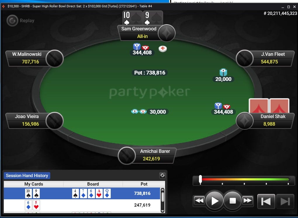 Blinds 20k/40k/5k (ante). It fold to me on the button and I jam 344k with Ts9s. Dan Shak with 353k in the BB calls with A5 suited and wins.